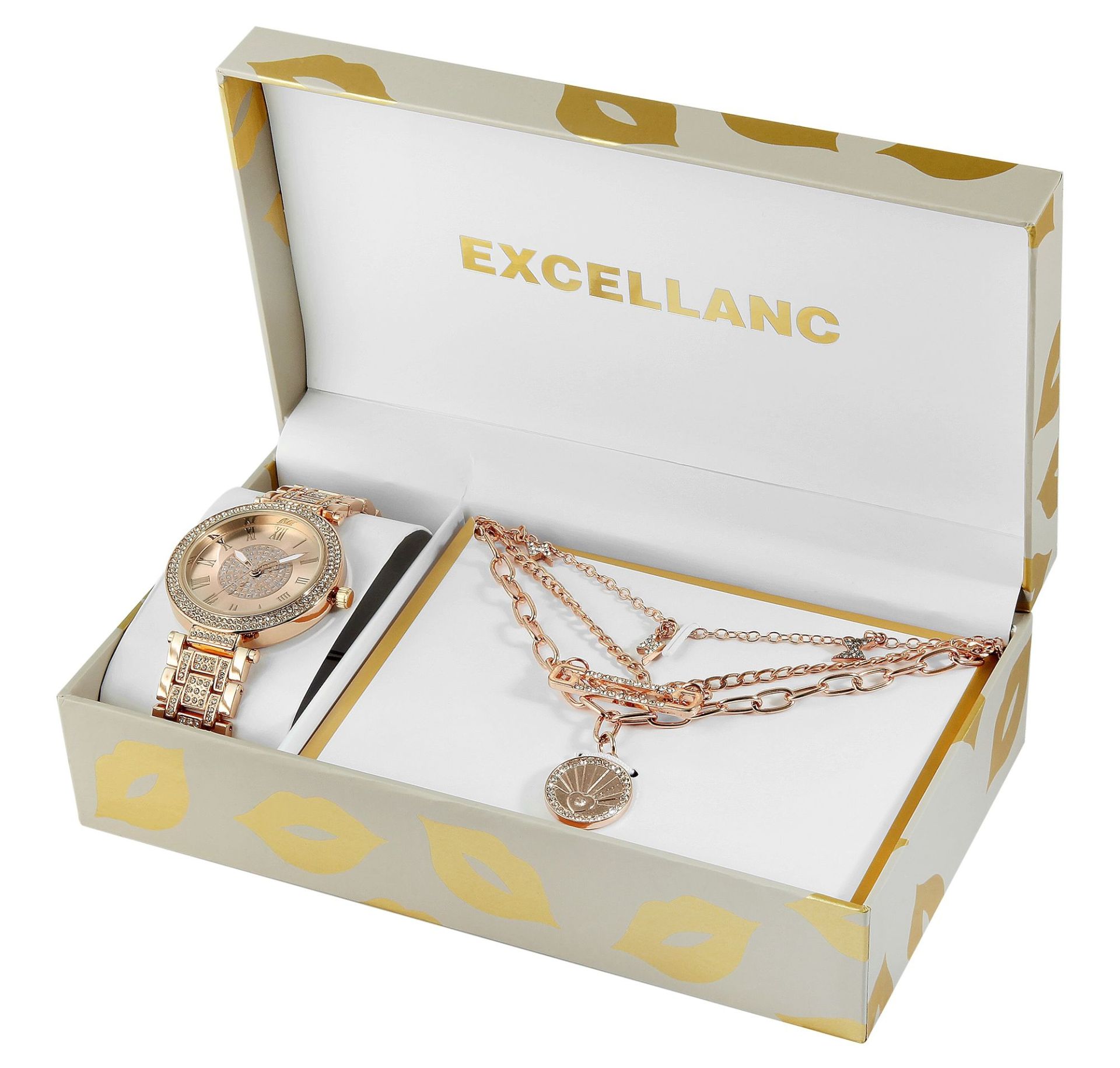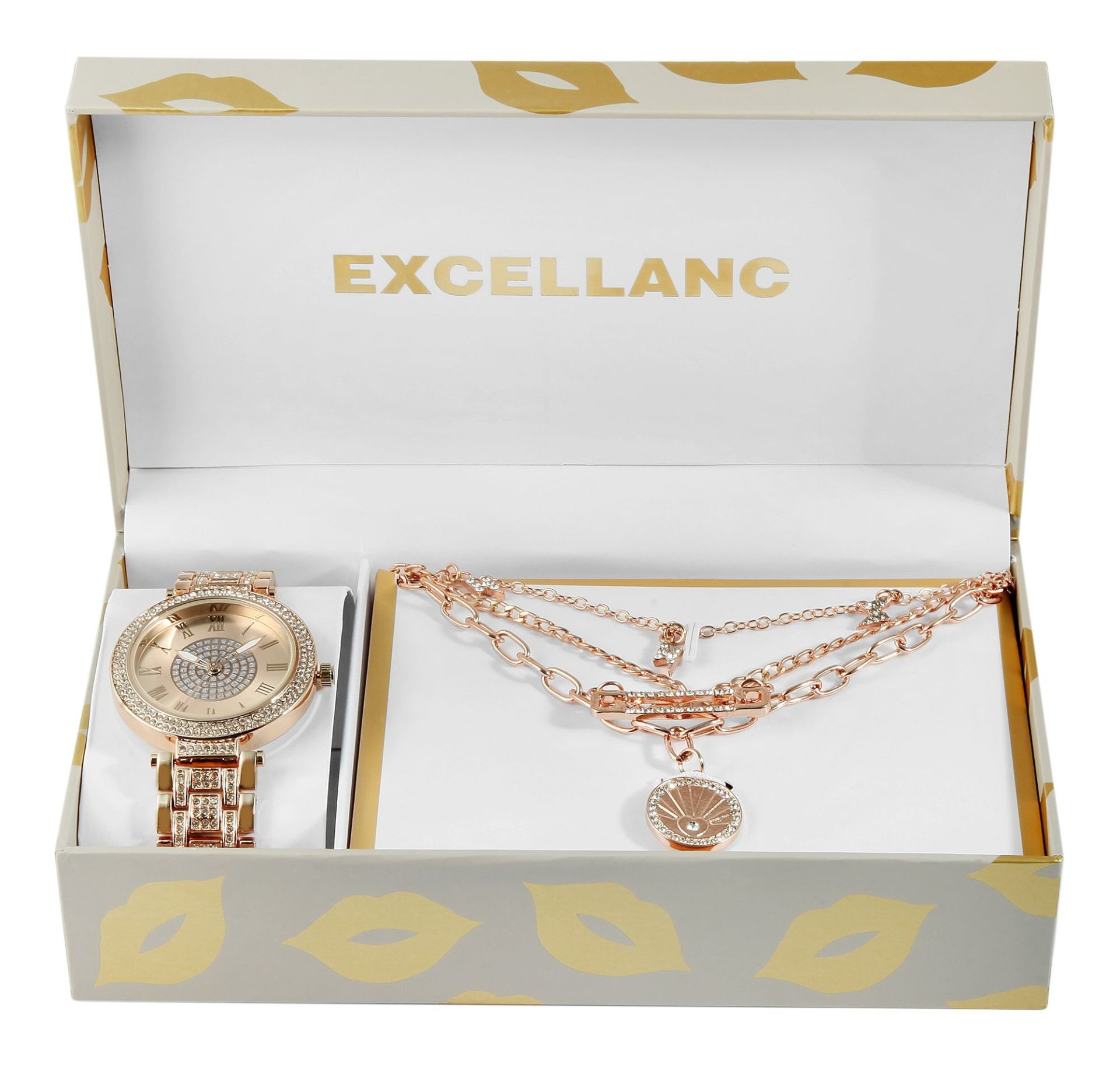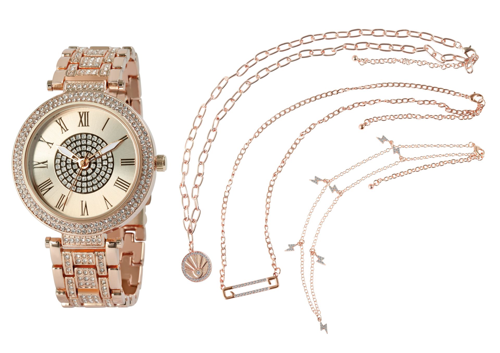 Fém szíjas női karóra, ami mellé tartozik három nyaklánc medálokkal.